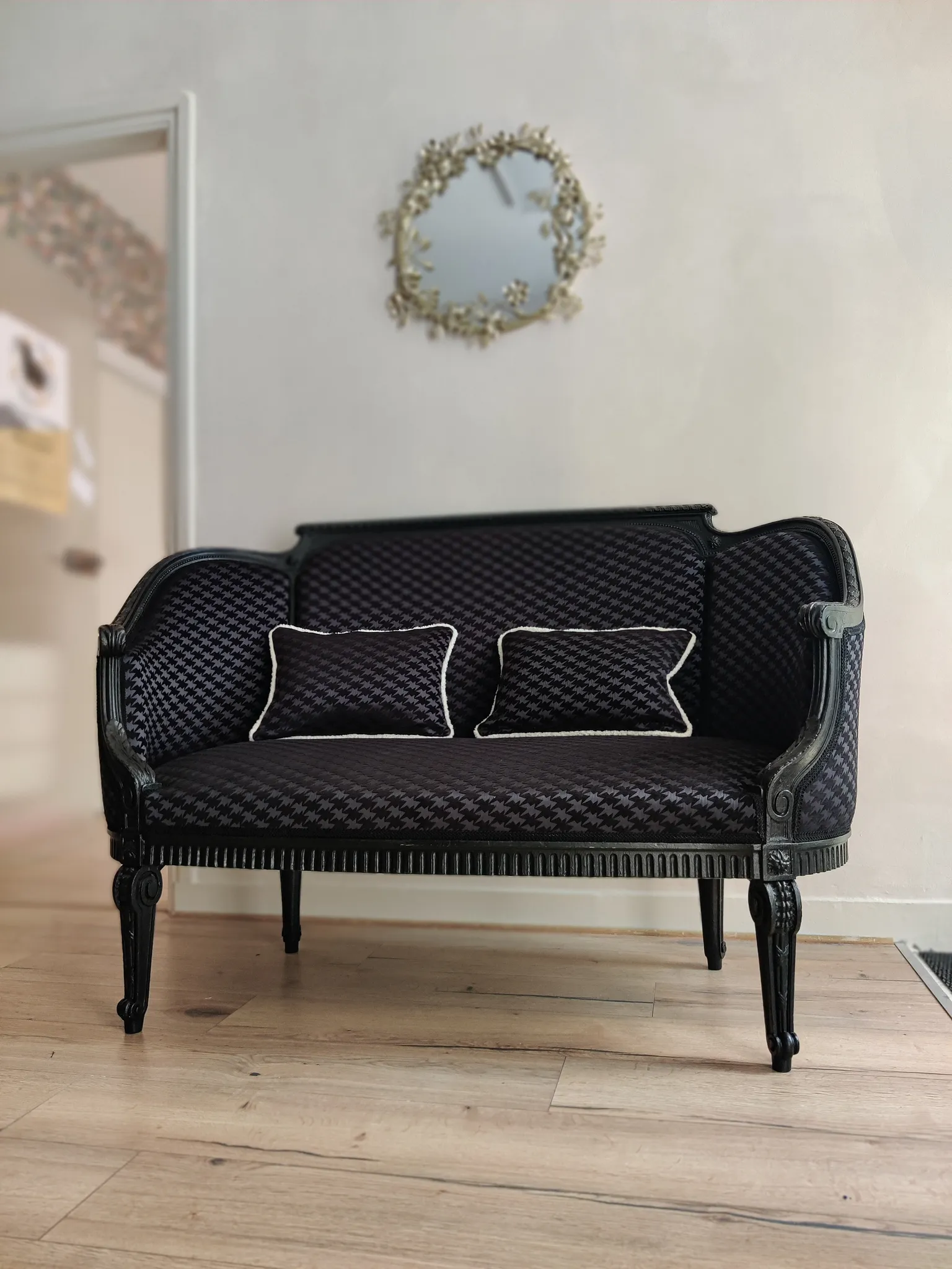 Canapé "Louis Xvi" 1600 € Produit épuisé! Très joli canapé 2 places style Louis XVI, repeint et verni, entièrement réfectionné en mousse. Tissu de chez Kirkby Design, passementerie Plume&laine. 2 coussins 30x40 inclus.