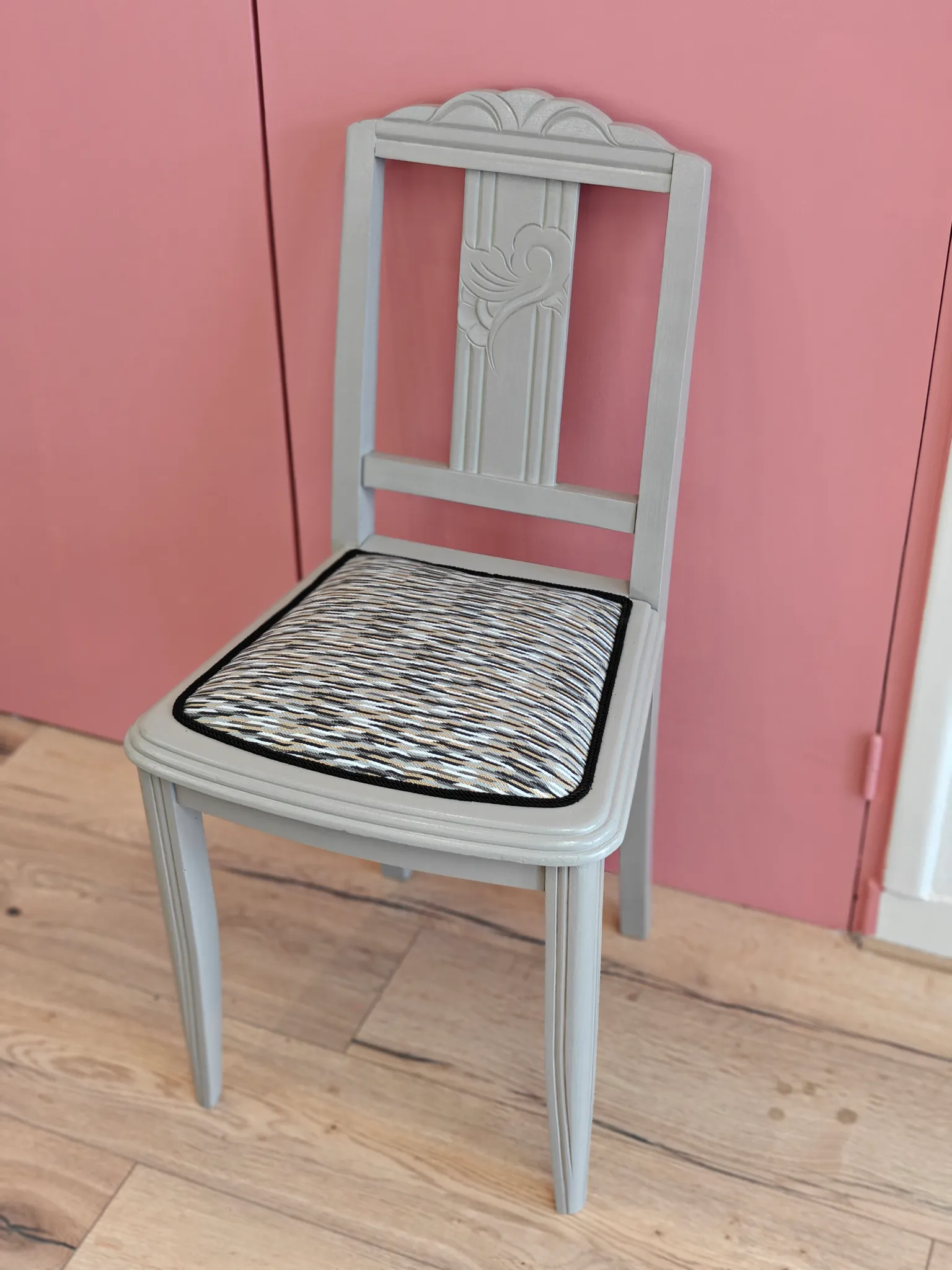 Chaise art déco 175 € + 80,00 € de frais de livraison (hors Finistère) Chaise d'époque art déco, peinte en gris clair, réfection complète semi traditionnel. Tissu de chez Métaphores Paris et galon corde de chez plume et laine. Acheter