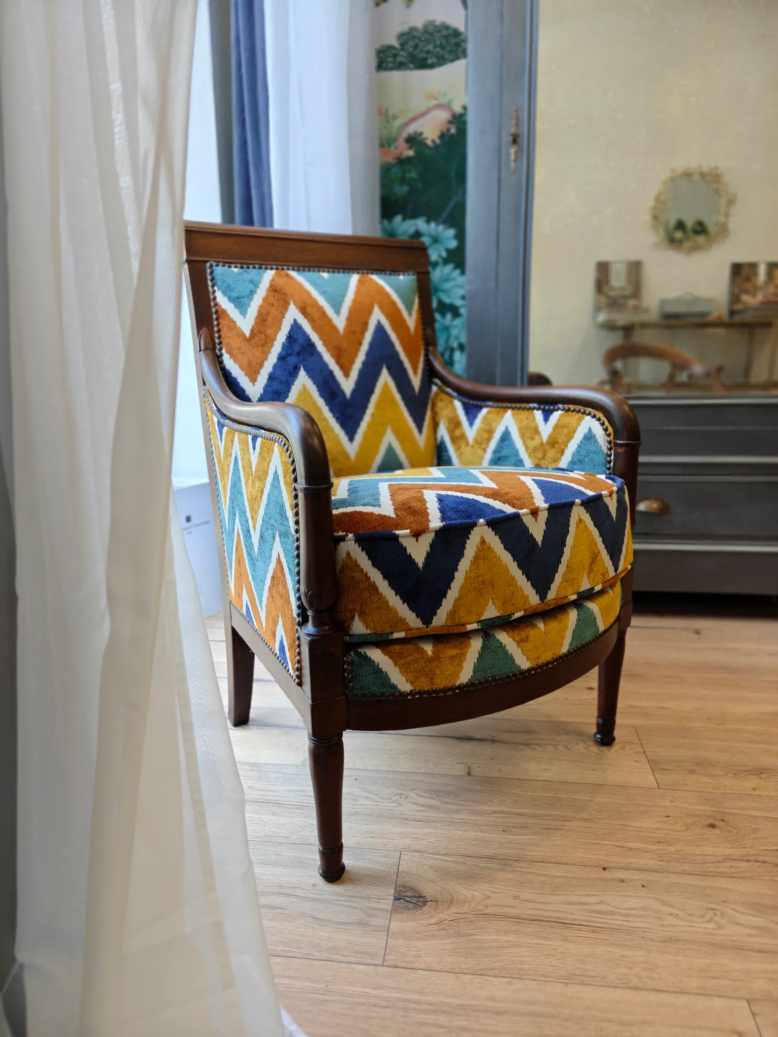 Photo entièreBergère empire, réfection complète en traditionnel excepté le coussin en mousse. Tissu de chez Dekoma.