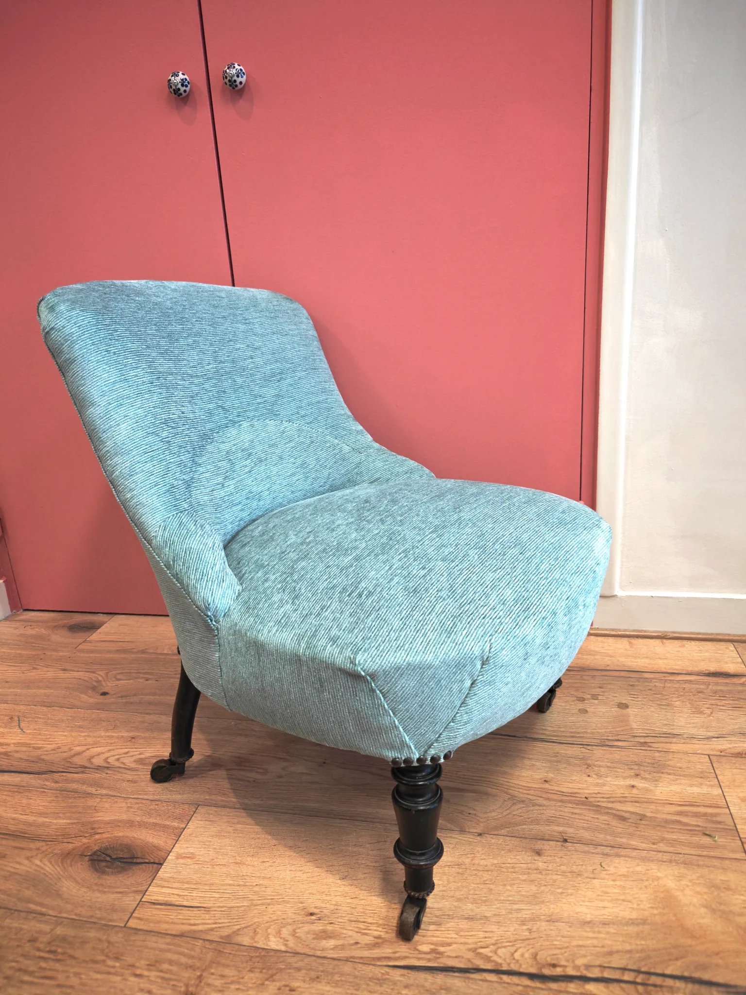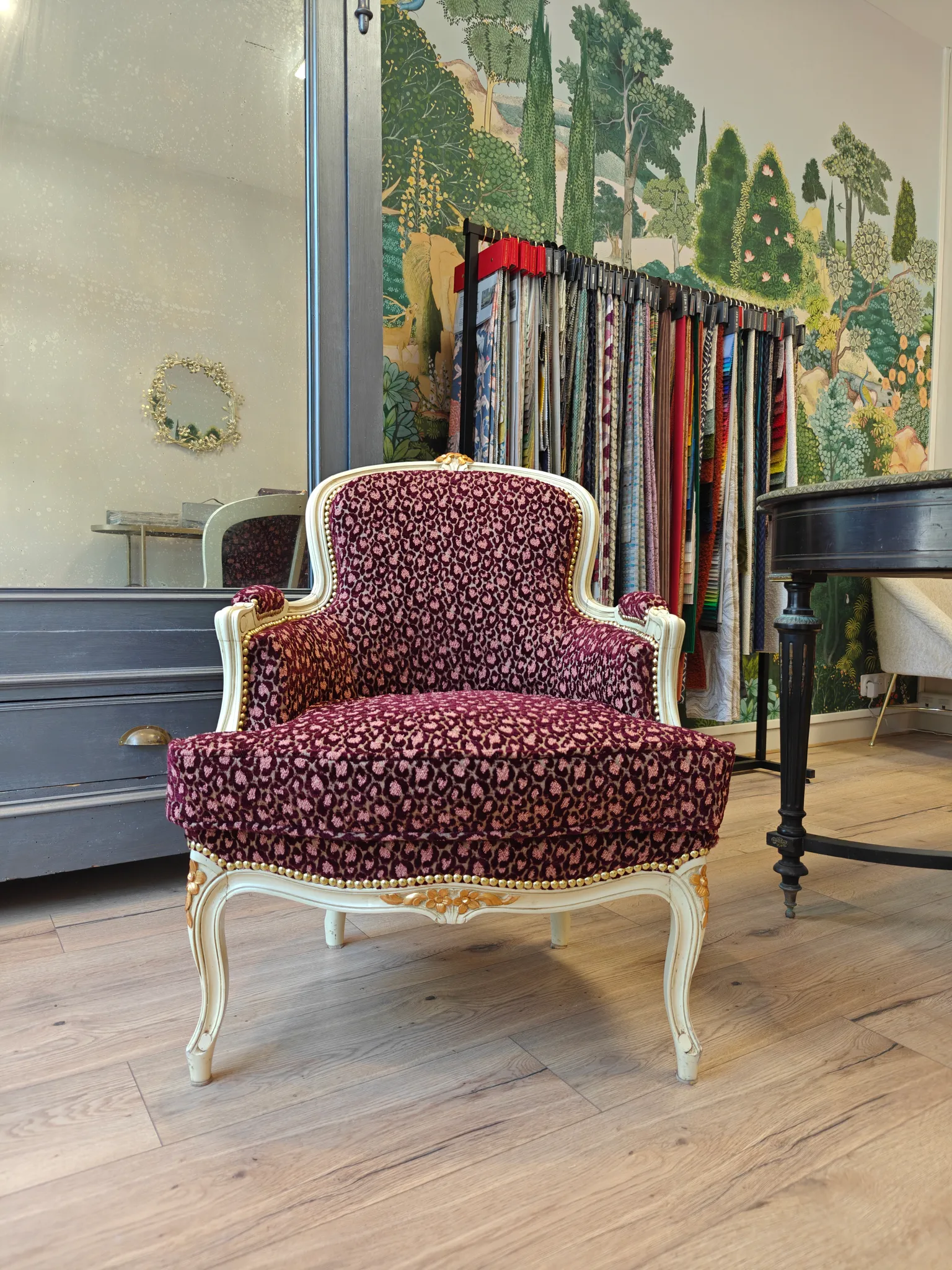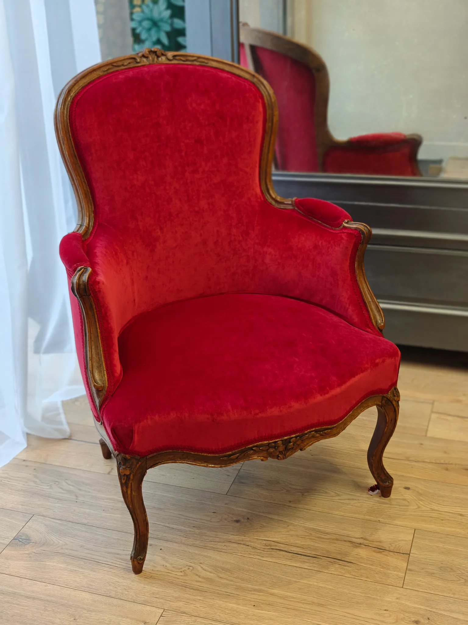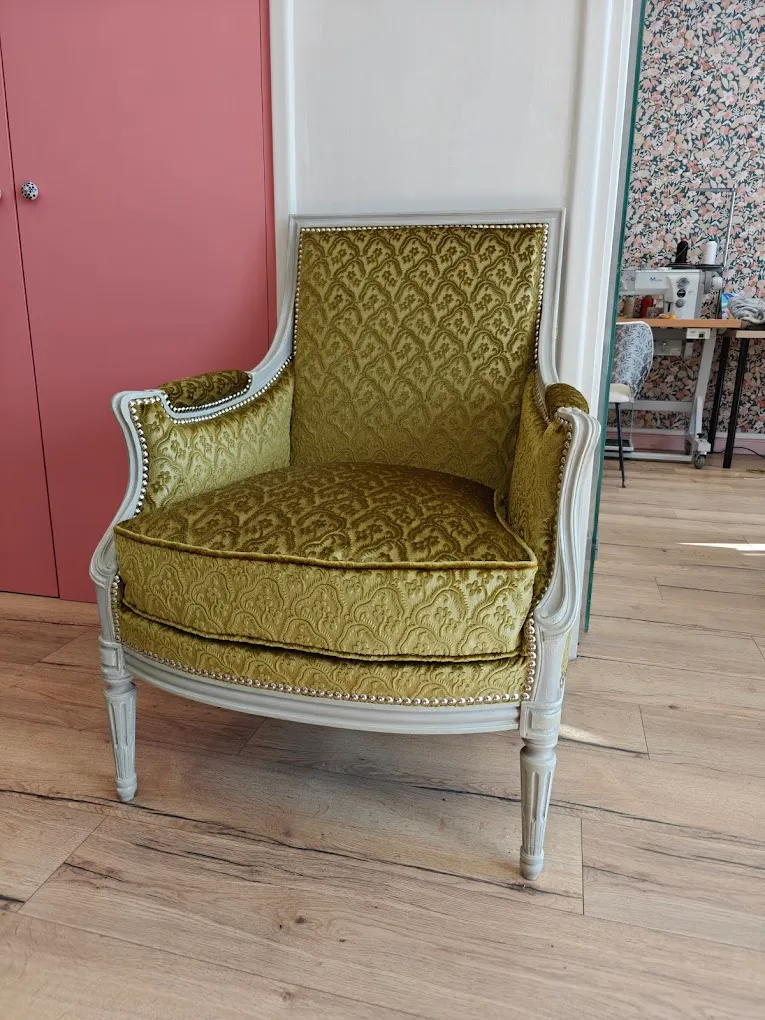Photo entièreCouverture, et guindage pour cette bergère d'époque Louis Xv estampillée. Velours framboise de chez Jab, finition galon crête de chez plume&laine.