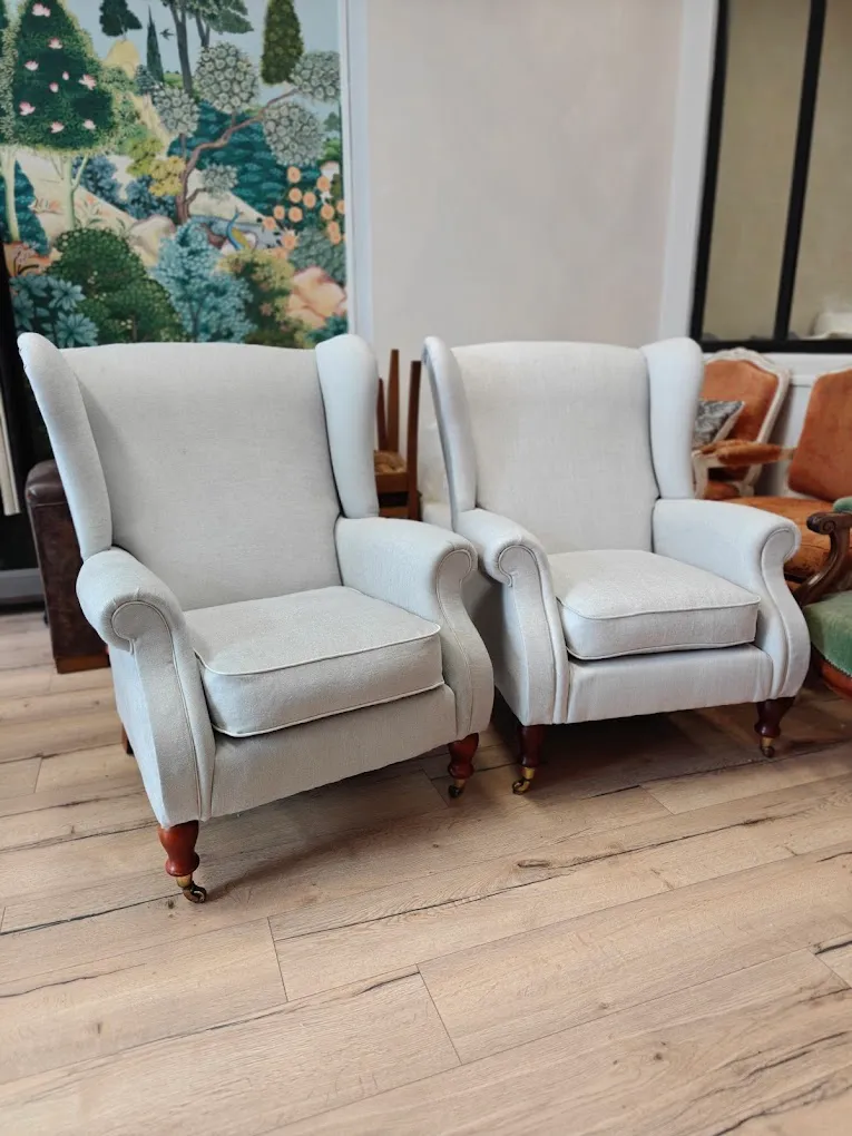 Photo entièrePaire de Bergères à oreilles de la marque Parker-Knoll restaurées dans un tissu lin et coton de chez JAB.