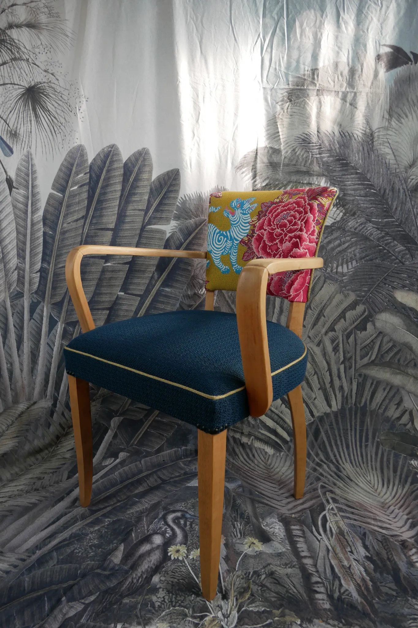 Photo entièreChaise Bridge des années 1920-1930, réfection totale en traditionnel. Tissus jacquard à motifs doré pour le dossier, et tissus texturé bleu pour l'assise. Finition passepoil doré de chez Houlès.