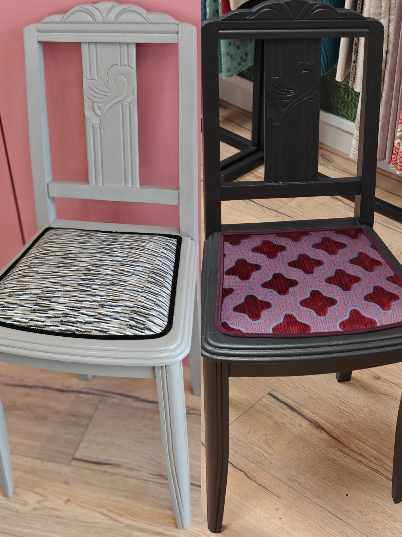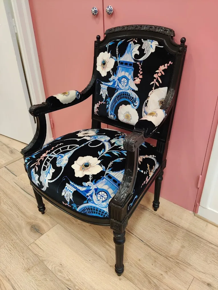 Photo entièrePaire de chaises art déco, entièrement restaurées individuellement dans un style unique à chacune. En semi traditionnel, tissu de chez Métaphores Paris, galon plume et laine.