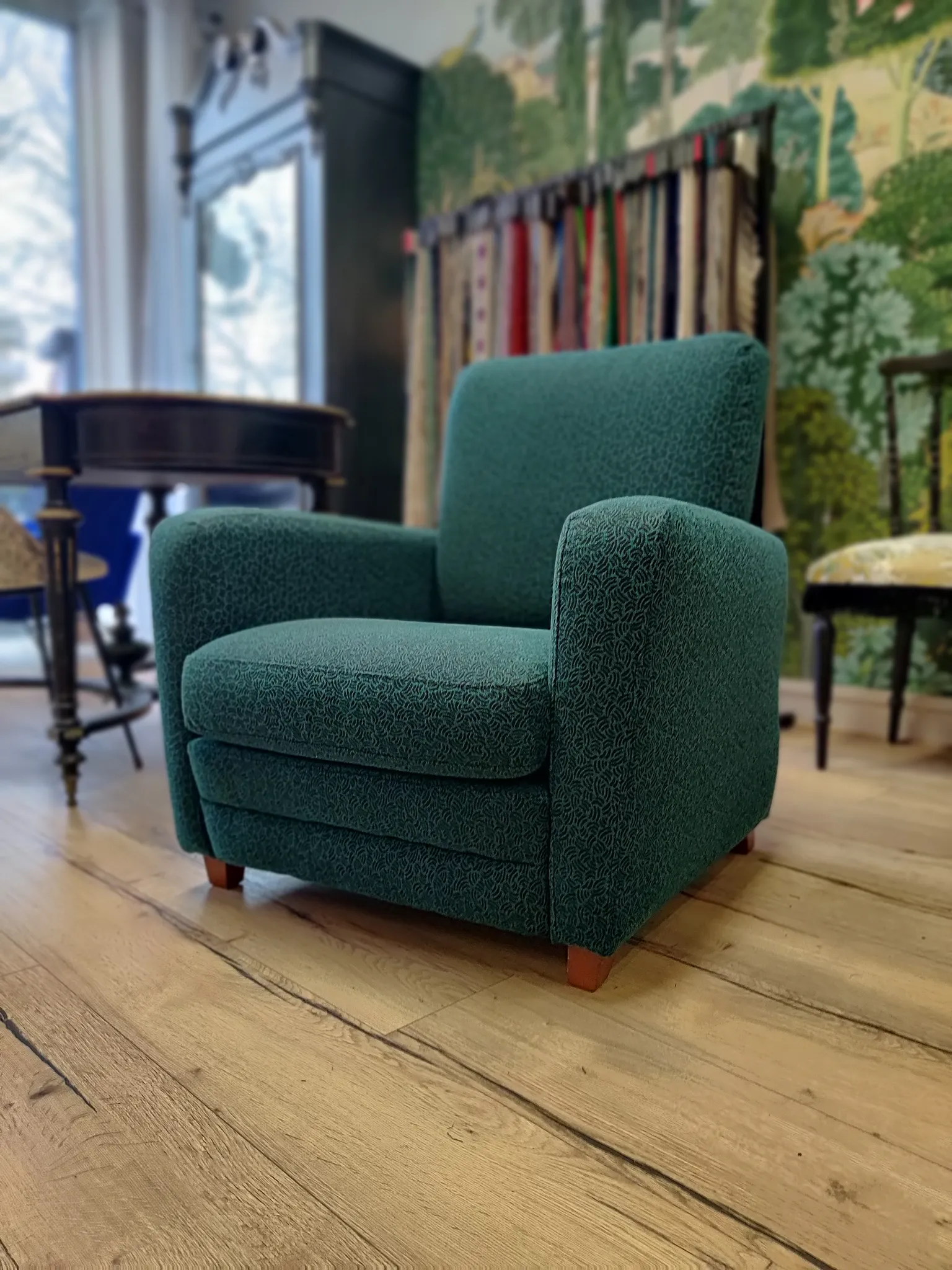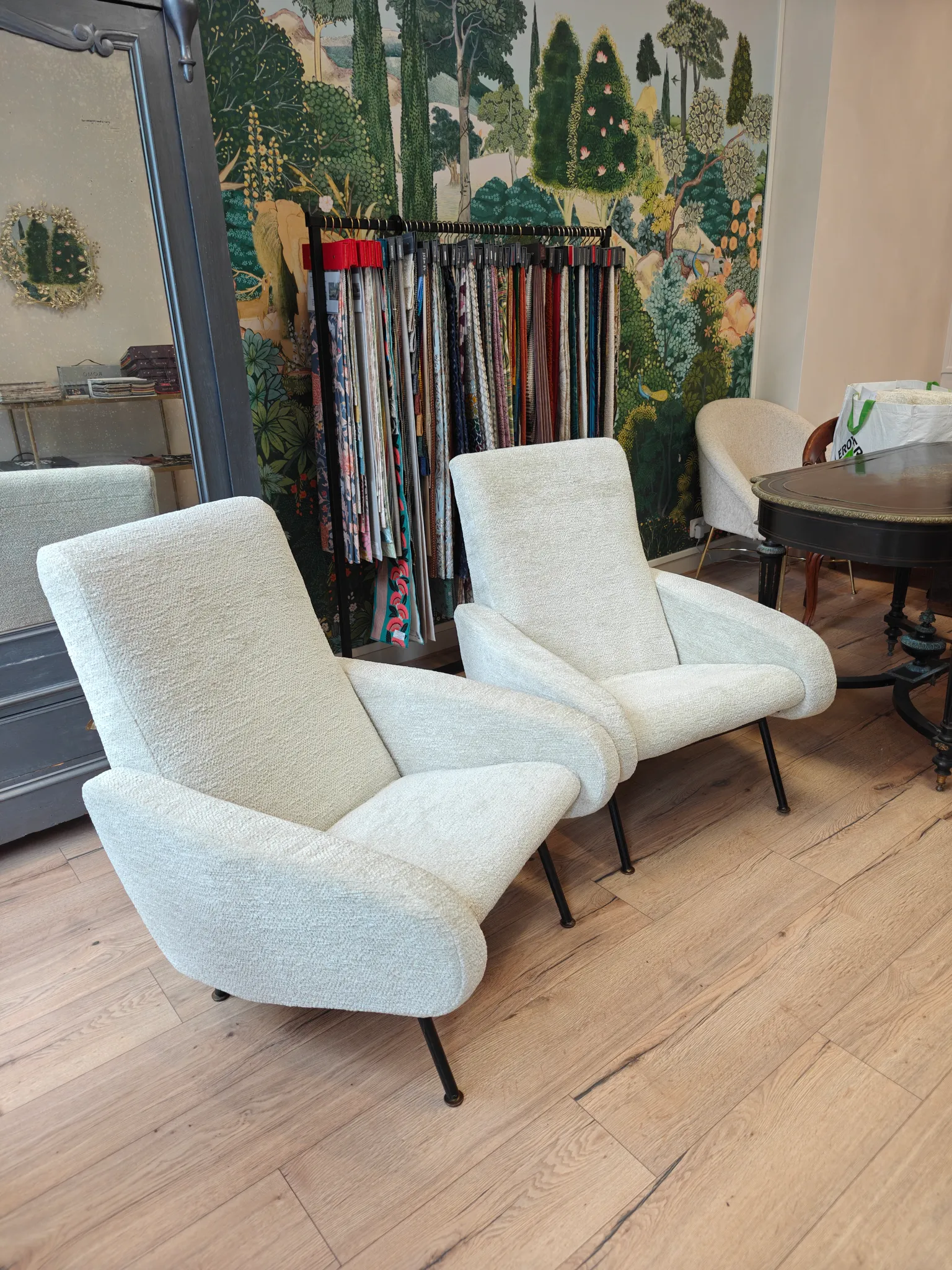 Photo entièreRéfection complète de cette paire de fauteuils des années 70. Tissu chenille de chez Jab.