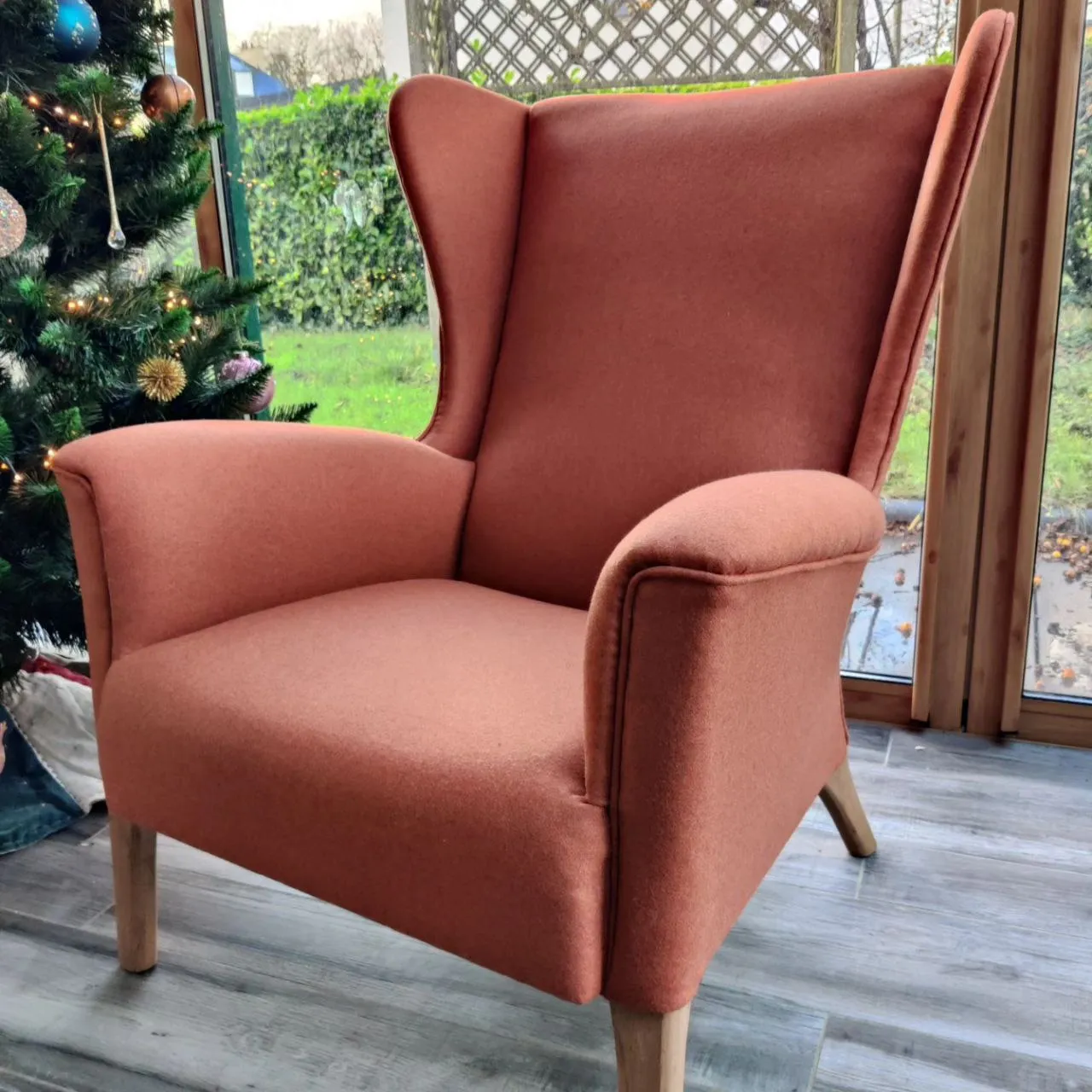 Photo entièreFauteuil de la marque Parker Knoll, entièrement restauré en mousse et kapok, tissu lainage de chez 43 west. Le confort absolu.