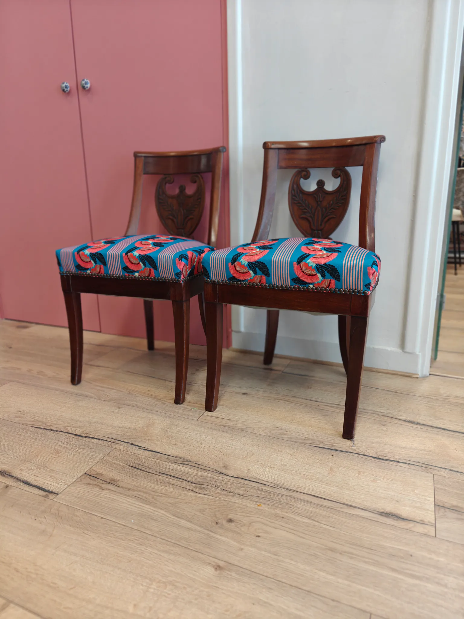 Photo entièreCouverture avec un tissu de chez thevenon pour ces chaises empire.